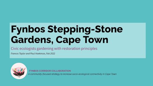 I develop online tools that help with site selection and plant selection to support members of the public, local greening organisations, and municipalities to collaborate on corridor building. Example: Fynbos Corridor Collaboration